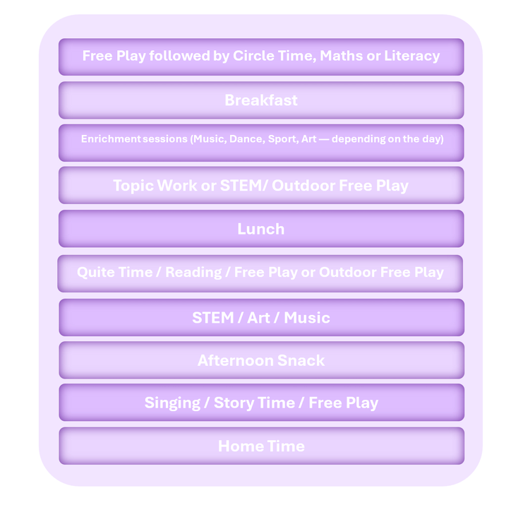 Afternoon Activities: Dance, drama, art, music, or language-based sessions depending on the day.