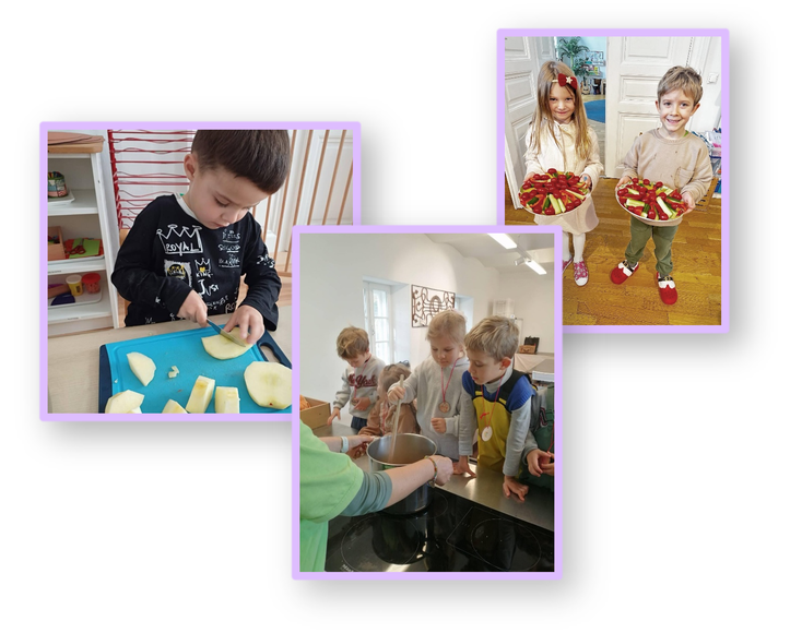 Children take part in simple food preparation — laying the table, cutting fruit and vegetables, and helping with cooking — building practical